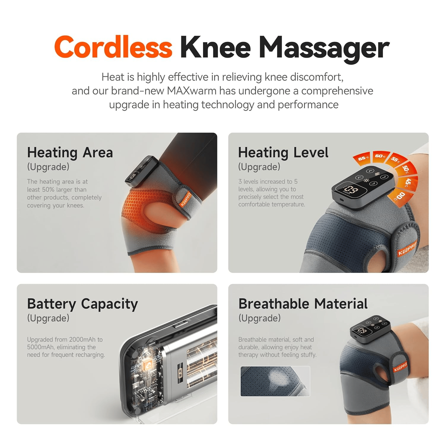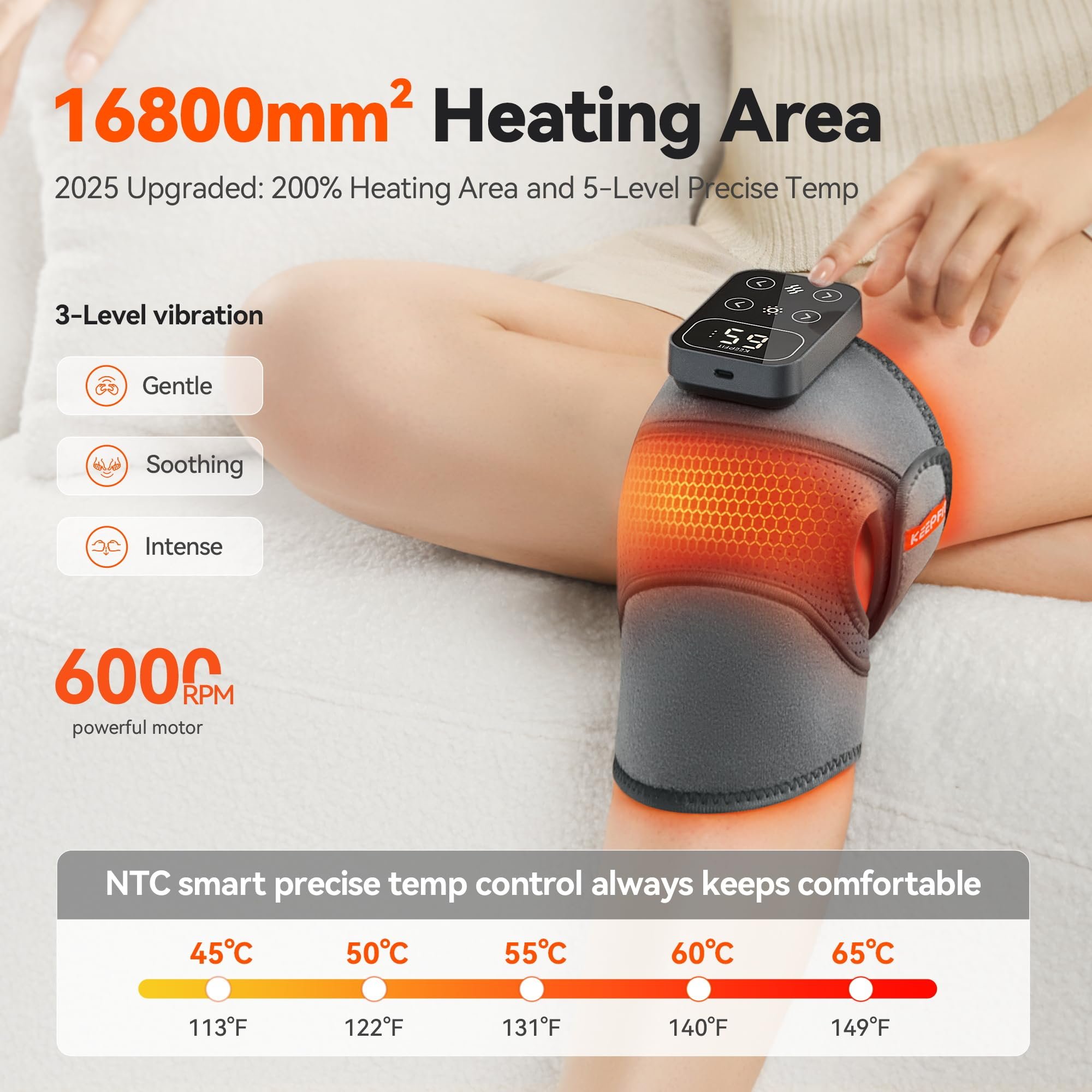 MAXwarm Knee 4.0: 2025 completely upgraded, double the heat for knee pain relief, with 100% expansion of the heating area up to 16,800 mm², enjoy full 360-degree coverage for your knees with 5 precise temperature settings adjustable between 113 to 149°F.